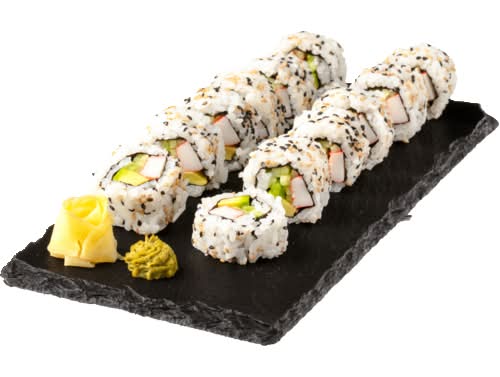 Ingredients: Sushi Rice (White Rice, Water), Cucumber, Avocado, Imitation Crab (Alaska Pollock, Sugar, Sorbitol, Tetrasodium Pyrophosphate, Sodium Tripolyphosphate, Water, Starch [Modified Tapioca, Wheat], Fructose Syrup, Salt, Crab Flavor, Crab Extract, Flavor Enhancer, Cochineal Extract, Paprika), Vinegar (Sugar, Grain Vinegar, Salt, Brown Sugar), Sushi Ginger (Ginger, Acetic Acid, Citric Acid, Vinegar, Sugar, Ascorbic Acid, Salt, Water), Soy Sauce (Water, Wheat, Soybeans, Salt), Water, Natural Wasabi (Horseradish, Mustard, Cornstarch, Vitamin C, Vegetable Powder For Coloring, Turmeric, Citric Acid), Seaweed, Sesame Seeds