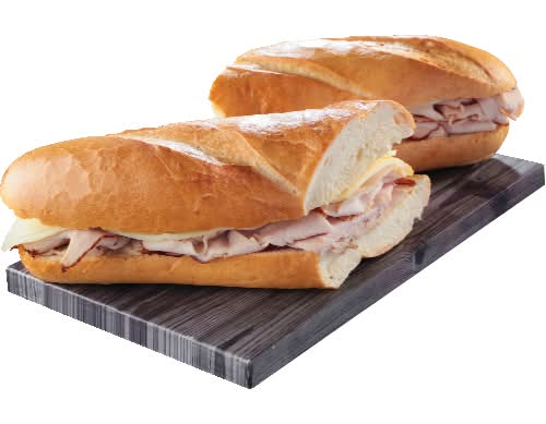 Made fresh in our deli, this hearty sandwich stacks tender slices of savory ham with creamy provolone cheese on a crisp, golden baguette. A smooth layer of hummus adds richness and pairs perfectly with every bite.