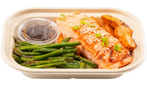 Ingredients: INGREDIENTS: GRILLED ATLANTIC SALMON (Atlantic Salmon [astaxanthin added for color], Extra Virgin Olive Oil, Salt), ROASTED SWEET POTATOES (Sweet Potatoes, Marinade [Canola Oil, Salt, Dehydrated Vegetables {Onion, Bell Pepper, Leek}, Palm Fat, Natural Flavors, Spices {Contains Turmeric}, Onion Powder, Spice Extracts]), ROASTED GARLIC GREEN BEANS (Green Beans, Marinade [Canola Oil, Salt, Palm Fat, Herb {Wild Garlic, Sage, Parsley}, Spice Extracts, Onion Powder, Spices]), RED MISO GLAZE (Mirin [Water, Dextrose, Rice, Corn Syrup, Salt], Water, Brown Sugar, Red Miso Paste [Filtered Water, Organic Soybeans, Rice, Sea Salt, Koji Starter {Aspergillus Oryzae}], Salt, Modified Corn Starch, Caramel Color, Contains Less than 2%: Red Bell Pepper, Garlic, Xanthan Gum), GREEN ONIONS, SESAME SEEDS