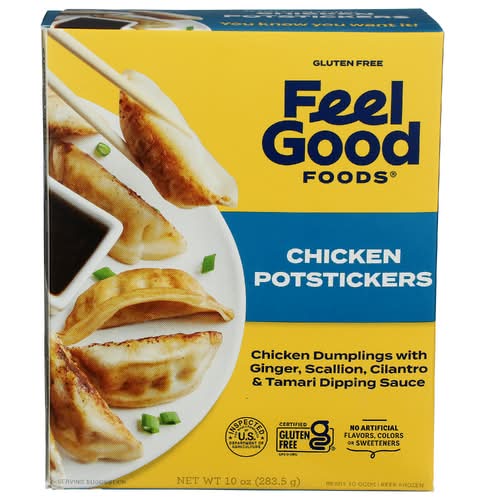 Ingredients: Dipping Sauce: Water, Tamari Soy Sauce (Water, Soybeans, Salt, Sugar, Corn Starch), Sugar, Distilled Vinegar, Ginger Puree (Ginger, Water), Garlic Puree, Spice, Potstickers: Chicken, Cabbage, Water, Rice Flour, Tapioca Starch, Sesame Oil, Canola Oil, Contains 2% Or Less Of: Scallion, Salt, Garlic, Konjac Flour, Xanthan Gum, Ginger, Cilantro, Black Pepper