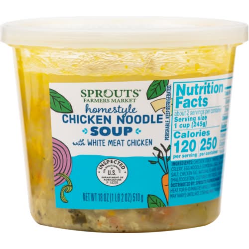 Ingredients: Chicken Stock (Water, Chicken Bones, Onions, Celery, Carrots, Sea Salt, Garlic, Parsley, White Pepper, Thyme, Bay Leaves, Marjoram), Chicken (Light Meat), Water, Carrots, Celery, Egg Noodle (Semolina, Eggs, Egg White, Niacin, Iron [Ferrous Sulfate], Thiamin Mononitrate, Riboflavin, Folic Acid), Onions, Chicken Flavor Broth Concentrate (Chicken Stock, Salt, Chicken Fat, Natural Flavor, Vegetable Juice Concentrate [Celery, Onion, Carrot], Lactic Acid, Xanthan Gum), Chicken Fat, Sea Salt, Garlic, Cultured Dextrose (Maltodextrin, Cultured Dextrose), Sugar, Onion Powder, Garlic Powder, Lemon Juice, Parsley, Black Pepper, Thyme, Turmeric, Lemon Oil, Dill Weed