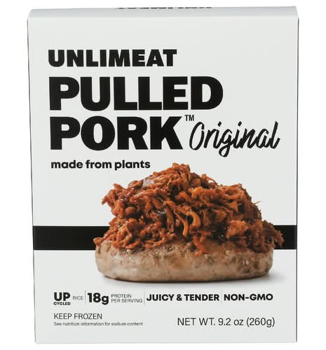 Ingredients: Water, Plant-Based Pork Protein (Soy Protein, Wheat Protein, Corn Starch, Soy Flour, Wheat Starch), Sugar, Vinegar, Tomato Paste, Corn Syrup, Soybean Oil, Refined Coconut Oil, Rice Bran Powder, Potato Flour, Salt, Dextrose, Natural Flavors, Molasses, Yeast Extract, Spices, Modified Tapioca Starch, Dextrin, Xanthan Gum, Maltodextrin