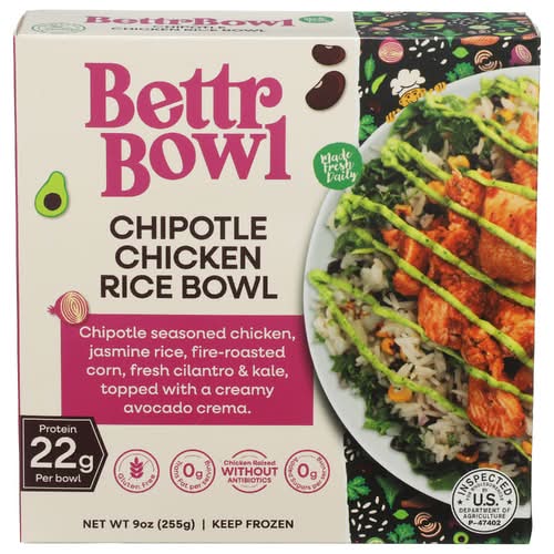 Ingredients: Jasmine Rice, White Chicken Meat, Water, Onion, Black Beans, Super Sweet Yellow Corn, Avocado, Sour Cream (Grade A Cultured Pasteurized Cream And Gelatin), Chipotle (Chipotle Peppers, Water, Tomato Puree, Vinegar, Salt, Sugar, Garlic, Canola Oil), Tomato Paste (Vine Ripened Tomatoes), Kale, Cilantro, Fresh Lemon Juice, Sea Salt, Avocado Oil, Garlic, Secret Spices