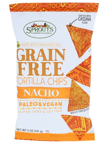 Grain Free Nacho Tortilla Chips. Paleo and Vegan. Gluten, Dairy and Soy free. Crafted with cassava flour. Made with avocado oil.