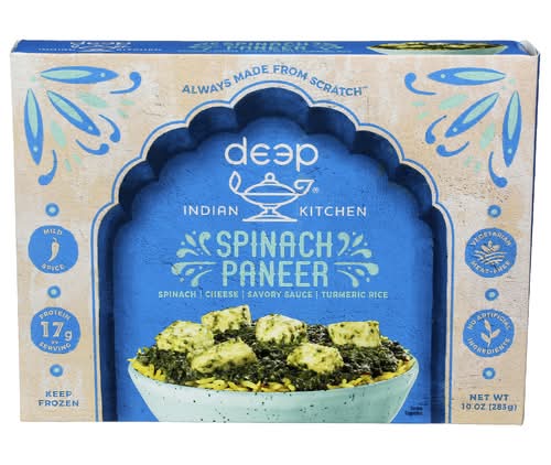Ingredients: Spinach Paneer - Spinach, Paneer (Pasteurized Milk, Nonfat Dry Milk, Acetic Acid), Onions, Tomatoes (Tomatoes, Tomato Juice, Salt), Expeller-Pressed Canola Oil, Broccoli, Cream, Water, Spices, Tomato Puree (Water, Tomato Paste), Nonfat Dry Milk, Garlic, Salt, Green Chili, Chickpea Flour, Sugar, Turmeric, Ghee (Clarified Butter), Fenugreek Leaves, Turmeric Rice - Water, Basmati Rice, Turmeric