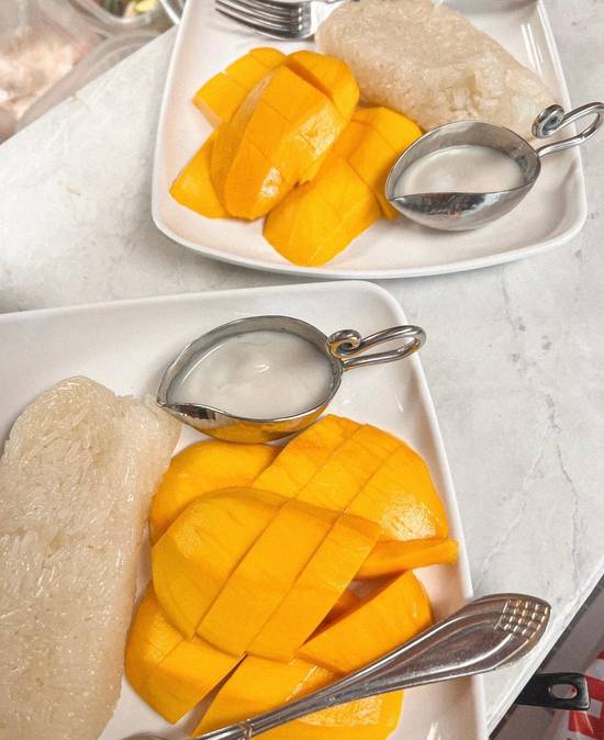 Mangos with sweet sticky coconut rice and coconut sauce.