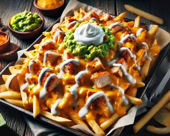 Fresh, crispy French fries loaded with nacho cheese, melted jack cheese, perfectly marinated chicken, crema fresca and topped with handcrafted guacamole for an irresistible flavor explosion!