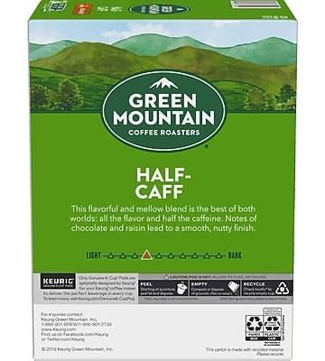 Give guests a delicious beverage option with these Green Mountain Coffee Roasters Half-Caff coffee Keurig K-Cups. Stock beverage stations and break rooms with these Green Mountain Coffee Roasters Half-Caff coffee Keurig K-Cups. Notes of chocolate and raisins deliver a rich, smooth taste, while the half-caffeinated format is a perfect option for a midday treat. These Green Mountain Coffee Roasters Half-Caff coffee Keurig K-Cups come in a 24-count package, ensuring a convenient supply for your staff or office visitors. This flavorful and mellow blend is the best of both worlds: all the flavor and half the caffeine. Notes of chocolate and raisin lead to a smooth, nutty finish. - Half caff coffee K-Cups for Keurig brewers - Medium roast coffee with flavorful, nutty, and mellow flavor - 24 K-Cups per box - Certified Orthodox Union Kosher (U) - Made with 100% Arabica coffee - Fair Trade Certified: Our farmers receive a fair price for quality products, can reinvest in their crops, communities and quality of life - Committed to 100% responsibly sourced coffee Introducing Recyclable* K-CUP PODS: Simple. Delicious. And now Recyclable. Enjoy the same great-tasting coffee you know and love, and when you’re done just peel, empty and recycle. *Check locally, not recycled in all communities. Packaging may vary.