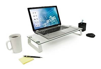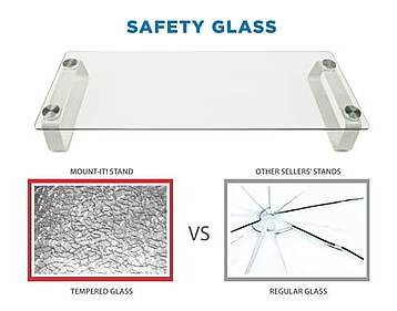 Optimize Desk Space and Reduce Strain with the Sleek MI-7262 Monitor Riser Mount-It! MI-7262 monitor stand elevates the display to a more comfortable height for optimal viewing experience and help reduce neck and eye strain. Contemporary design with the premium glass and Aluminum materials used makes it a perfect fit for any room or office. It is ideal for cramped workstations and desks as it expands your work area upward, maximizing your available work area. - Desktop Riser raises monitor up to 3.25 inches - 22 (Length) x 8.3 (Depth) x 3.25 (Height) - Multipurpose design can be used as Monitor Riser - Printer Stand - Laptop Stand - 3/8” premium tempered glass and brushed aluminum legs - Holds up to 44 lbs. - Supported by manufacturer's limited lifetime warranty Upgrade your desk with the Mount-It! MI-7262 monitor stand, crafted from high-quality tempered glass and brushed aluminum. This contemporary desktop riser elevates your screen for better posture and reduced eye strain while providing additional storage space underneath. Its strong, multipurpose design is perfect for any workspace