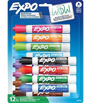 Many in stockOrganize ideas on the boardroom whiteboard with this 12-pack of Expo low-odor chisel tip dry-erase markers. EXPO Low Odor Dry Erase Markers use a specially formulated, alcohol-based ink with virtually no odor. Expo Low Odor Dry Erase Markers feature vivid ink that’s easy to see from a distance and provides consistent color quality. These Expo dry erase markers erase cleanly and easily from whiteboards and other nonporous surfaces with a dry cloth or Expo eraser. The dry erase marker ink is specially formulated to be low-odor making it perfect for use in classrooms, offices and homes. Use your colorful Expo dry erase markers to track, schedule and present. - Chisel tip for broad, medium, or fine lines - Low-odor ink formula erases cleanly and is ideal for classrooms, offices, and home offices - For use on whiteboards and most non-porous surfaces - Bold color is easy to erase and easy to see from a distance - Includes 12 dry erase markers in assorted colors: black, red, blue, green, orange, brown, plum, purple, aquamarine, pumpkin, lime, and pink - Safety Data Sheet