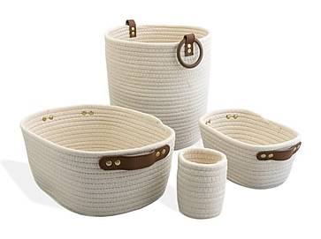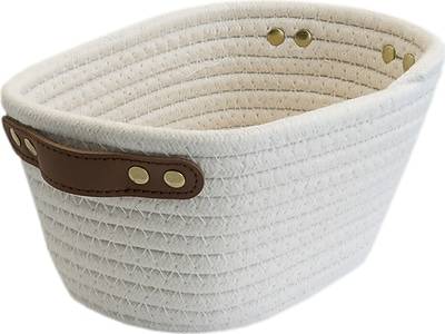 This Martha Stewart small rope basket is great for storing different items and adds a rustic accent to any room space. - Small basket with handles is great for storing different items - Made of natural cotton in cream color with brown leather handles - Dimensions: 4H x 8W x 5D - Rope basket adds a rustic accent to any room space
