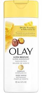 Reveal beautiful, healthy-looking skin with the Olay Ultra Moisture body wash with shea butter. Now formulated with Olay's vitamin B3 complex, this body wash hydrates to plump surface skin cells, locking in natural moisture. The advanced formula, with shea butter and Olay moisturizers, indulges skin to leave it spa-soft and touchably smooth. - Reveal beautiful, healthy-looking skin with this body wash - Indulges skin to leave it spa-soft and touchably smooth with a pleasant shea butter scent - Comes in a 3 fl. oz. squeeze bottle - Visibly transforms your skin in just two weeks, leaving skin feeling smooth and looking healthy - Proprietary skin care formula, made with a vitamin B3 complex, helps transform your skin - Ingredients: water, petrolatum, sodium trideceth sulfate, sodium chloride, cocamidopropyl betaine, trideceth-3, fragrance, niacinamide, butyrospermum parkii (shea) butter, sodium citrate, guar hydroxypropyltrimonium chloride, sodium benzoate, xanthan gum, glyceryl oleate, citric acid, disodium edta, acrylates/c10-30 alkyl acrylate crosspolymer, methylchloroisothiazolinone, methylisothiazolinone, yellow 5, red 33 - Safety Data Sheet