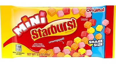 The Starburst Original mini fruit chews pack a big burst. With these candies, there are plenty of ways to enjoy the miniature, unwrapped chewy fruit-flavored squares you know and love. With an experience that is different every time, let the flavors of strawberry, cherry, orange, and lemon set your imagination free. - Miniature, unwrapped chewy fruit-flavored squares you know and love - Net weight: 3.5 oz. - Serving size 1 oz. (110 calories) - Ingredients: sugar, corn syrup, palm oil; less than 2% of: citric acid, sodium citrate, pectin, apple juice from concentrate, mono- and diglycerides, confectioner's glaze, natural and artificial flavors, colors (yellow 6, red 40, yellow 5, blue 1), carnauba wax