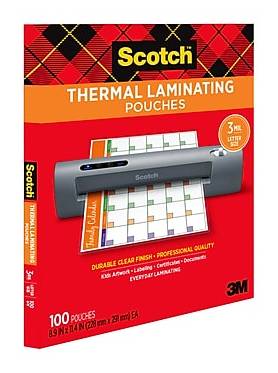 These are 3 mil thick thermal laminating pouches for use in a thermal laminator. They come in a pack of 100, and are letter size pouches. 6 packs/shipper. Scotch Thermal Laminating Pouches protect documents you handle frequently. These thermal laminating pouches are for use with thermal laminators. Pouches are clear to let important information show through. Letter size - Safe for use with most household cleaners* - Thermal Pouches up to 8.5x11 - Ideal for protecting items from damage Delivers a clear, professional and photo-safe finish - 100 per package - Great for children's artwork, signs, flyers, schedules, certificates, and other frequently used documents in the home, office or classroom - Protects and adds professionalism to business documents - Ultra clear finish to let important information show through - Ideal for marker-proof, tear-proof and spill-proof paper items that you want to last - Recommended to use with Scotch Thermal Laminators