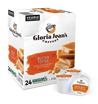 Pour yourself a cup of steaming flavorful coffee with this 24-pack of Keurig K-Cup Gloria Jean's butter toffee coffee pods. Experience the sweet taste of caramel with these Gloria Jean's butter toffee coffee pods. The creamy texture makes this coffee smooth to drink, and it's caffeinated to help you get through the morning. These Keurig K-Cup Gloria Jean's butter toffee coffee pods come with 24 in each pack, so there's enough for everybody in the office. - Coffee K-Cups for Keurig brewers - Medium-roast coffee with Butter Toffee flavor - 24 K-Cups per box - The product is kosher Packaging: Reusable