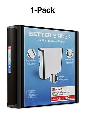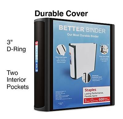 Archive, protect and store important documents with this Staples Better 3-inch three-ring 600-sheet D-ring binder. Organize your documents easily with this 3-inch three-ring view binder. The sturdy polyurethane material protects pages with a nonstick cover that doesn’t peel toner yet has the flexibility to withstand pressure in storage and when sitting upright on a shelf. Patented D rings are larger than traditional rings, capable of storing up to 600 pages of organized files. This Staples Better view binder has a rubberized edge and spine that prevents flex, tear and misalignment of rings. - Black better binders to protect work documents and keep them organized - 3 inch binder - Dimensions: 11.7H x 12.1W x 3.9D - Three D-Rings keep pages secure - Holds up to 600 sheets for maximized storage - Wide design accommodates letter-sized papers - Three pockets for organization - Insert a custom removable spine label for easy identification of the contents Rubberized Flex When binders bear heavy weight, many will split or tear under the pressure. Thanks to its rubberized edges and spine, the 3 Staples Better view binder only flexes under those circumstances. This protects the overall integrity of the binder while saving the rings from damage. Bent or misaligned rings don't open and shut properly, which causes sheets to catch as pages are turned in the binder. Organized Storage The Staples 600-sheet D-ring binder's rings hold enough pages to accommodate ongoing reports, large project files or reference manuals. The easy-insert spine label keeps shelf space organized by giving the binder a readable label. Important pages, such as a cover letter, table of contents or glossary, store easily in the interior pocket so they're close at hand when needed.