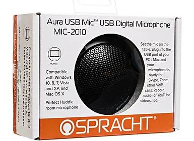 Why use an external microphone instead of your computer's? Well, everyone will be heard better, since the microphone can be perfectly located between all the people in the room. Also, because USB microphones process sound internally, they act as their own sound card when attached to a computer. So a USB microphone produces the same quality output regardless of the computer's hardware specs; they work better than analog microphones on computers with a cheap sound card or none at all. The Spracht Aura USB Mic is a perfect huddle room microphone. Set the microphone on the table, plug it into the USB port of your PC/Mac, and it is ready for Skype, Zoom, GoToMeeting, WebEx, other VoIP calls. Record audio for YouTube videos or podcasts, too. - Conferencing microphone great for everyday use with compatible electronic devices - Offers wired USB connectivity with a 6' USB 2.0 cable - Comes in black - Made of an aluminum alloy with a metal mesh cover - Echo- and noise-canceling technology decreases unwanted ambient sounds - USB Type-A connection for power and sound - -47dB (+/-3dB) microphone sensitivity ensures noiseless, clear audio - Captures audio within a frequency range of 100Hz-16kHz - Locate between the people in the room (pickup voice range is 6' to 9') - Omnidirectional for 360-degree coverage and 16-bit/48KB sample rate - Compatible with Windows 10/8/7/Vista/XP and macOS; ready for Skype, Zoom, GoToMeeting, WebEx, VoIP calls, and more - 1-year manufacturer limited warranty