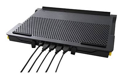 Make the most out of any workspace with a dual fan cooling mat that comes with a built-in 4-Port hub. Turn your laptop into a workstation with the 17 Chill Mat™+ with 4-port Hub. The Chill Mat+ combines a chill mat with all the important things you need when working at a desk. Dual fans keep your laptop cool; a 4-port hub allows you to connect all your peripherals, plus the adjustable height allows you to use it as a laptop stand. Use it flat, or at the highest setting (4”) with an external keyboard for better ergonomics. The Chill Mat+ with 4-Port Hub is the ideal solution for owners looking to get the most out of their laptop. - Compatible with Laptops up to 17 - Dual fans to help keep you and your laptop cool - 4-port Hub for connection to peripherals - Adjustable height (4 levels) lets you use as a laptop stand with external keyboard - Bottom ledge keeps laptop in place - Sturdy, durable construction Material - Limited 1 year warranty Packaging: Reusable