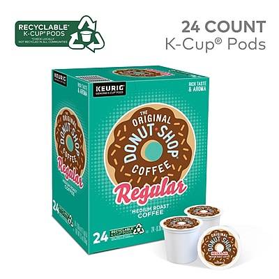 Keurig K-Cup Original Donut Shop Coffee- Rich Flavor, Classic Taste Before coffee was complicated, great coffee was simply fresh, bold, and flavorful. The Original Donut Shop Regular single serve K-Cup pods bring back the classic donut companion, with this ideally balanced brew of the highest quality beans...dunking is encouraged. Full-flavored and easy going, this medium roast blend embodies one of the best things in life - simply great coffee. These single-serve K-Cup pods are compatible with all Keurig K-Cup Pod Single-Serve Coffee Makers and brew up to 12 oz. of The Original Donut Shop Regular coffee each. Each K-Cup pod is filled with the freshest ground coffee and brews a perfect, great tasting cup of coffee, every time. Certified Orthodox Union Kosher and contains no artificial ingredients. Introducing Recyclable* K-Cup Pods: Simple. Delicious. And now Recyclable. Enjoy the same great-tasting coffee you know and love, and when you’re done just peel, empty and recycle. *Check locally, not recycled in all communities. Packaging may vary. - Gourmet coffee Keurig K-Cup pods - 24 Keurig K-Cup pods per box - The perfect cup of coffee every time with no mess and no clean-up - Slightly bright, smooth flavor with sweet overtones - This pack of twenty-four K-Cups is designed to work with Keurig coffee makers - Regular caffeinated coffee - Medium roast strength - Simply fresh, bold, and flavorful with this ideally balanced brew of the highest quality Arabica beans - No filters or loose coffee, just pop it in and brew - Brews either a 6, 8 or 10 oz. beverage depending on the machine - Not too harsh not too bitter - just right - Extra bold (contains more coffee than regular K-Cup pods) - No artificial ingredients and certified Orthodox Union Kosher (U) - Ensure high-quality coffee every time with pods specially designed to work in Keurig brewers with exact grind and extraction Packaging: Reusable