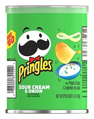 Dip into these crispy Pringles sour cream and onion chips for a satisfying snack. Grab a can of these chips to enjoy on the go. Tangy sour cream and onion gives these chips a delicious and classic flavor. Each chip is neatly stacked inside a 1.4-ounce can, ensuring they remain fresh and undamaged. Pringles sour cream and onion chips are a perfect addition to any break room or cafeteria. - Chips in sour cream and onion flavor are delicious and tempting - This product is kosher - 1.4. oz. package - Served in cans - Perfect for the office break room, meetings, and parties Packaging: Reusable