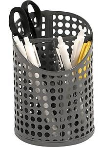 Sort markers, pens, pencils and highlighters with this Design Ideas Edison Angled three-compartment metal pen cup. Keep your workspace free from clutter with this metal pen cup. Three compartments make it easy to organize desk supplies, while the angled design offers easy access to contents stored inside. A neutral gray color and modern design let you bring a bit of style to your office or cubicle. Featuring an epoxy coating, this Design Ideas Edison Angled three-compartment metal pen cup provides long-lasting good looks. - Pen cup keeps pens and pencils organized - Comes in gray and made of epoxy coated metal - Dimensions: 6H x 4.25Dia. - Desk organizer provides three compartments, which can easily store all your supplies - Non-slip rubber feet reduce movement and protect your work surface from scratches and scuffs