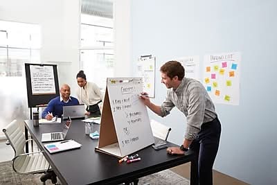 It’s an amazing feeling when your team just clicks-everyone feels a shared drive toward success. But, how do you ignite that feeling on every team? Capture the spark at your next meeting with Post-it Super Sticky Easel Pads. Adhesive backed sheets stick and re-stick to hold up to 2X longer to most wall surfaces, unlike flip chart paper. The paper resists marker bleed through so you can capture input by writing directly on the sheet. Use with Post-it Super Sticky Notes to organize ideas. - STICKS SECURELY AND HOLDS UP TO 2X LONGER - Easel paper can be repositioned without surface damage. No tape or tacks needed unlike standard flip chart paper. Keep agenda and ideas where everyone can see - INK BLEED-THROUGH RESISTANT PAPER - Large white premium self-stick flip chart paper that resists marker bleed-through to keep great ideas on the page, not on what's under the page - IDEAL FOR BRAINSTORMING AND MANAGING PROJECTS - Perfect for training or teaching sessions, brainstorming sessions, planning sessions, project management and agile processes, meetings and presentations - DOWNLOAD THE FREE POST-IT® APP - Whether you’re working or learning remotely, the Post-it® App is the perfect way to capture and share ideas, keep track of assignments, or create colorful calendars with your friends. Share across multiple platforms including Dropbox, Trello®, PowerPoint®, or synced across your devices - LARGE WHITE PREMIUM PAPER - 20 in. x 23 in., 20 Sheets/Pad, 1 Pad/Pack - NO EASEL STAND NEEDED - Includes a carry handle and built-in easel stand for portability - USE WITH POST-IT® SUPER STICKY NOTES - The large, stickable paper to capture thoughts with Post-it® Super Sticky Notes. Give ideas a place to grow - EXPLORE OPTIONS - Post-it® Super Sticky Easel Pads are also available with Grid Lines, Lines, Dot, Bright Yellow, and White Recycled Paper - EXPLORE SIZES - Post-it® Super Sticky Easel Pads also available in more sizes - Mini Easel Pad and Wall Pad - Made in the USA with globally sourced materials.