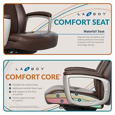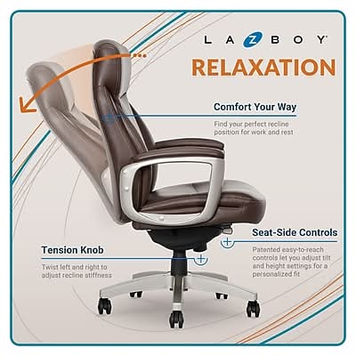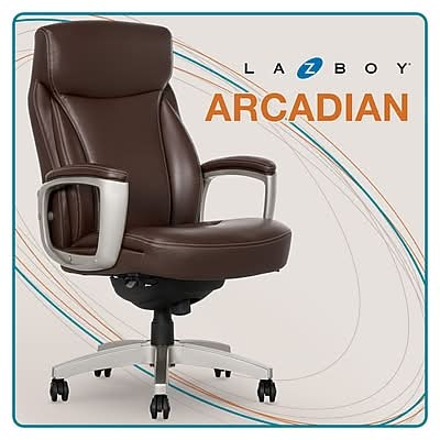 Exclusively from Staples Stay productive yet relaxed with the La-Z-Boy Arcadian bonded leather executive chair. The Arcadian is beautifully designed with smooth bonded leather upholstery and supportive multilayered ComfortCore seat construction to target body discomfort and promote circulation for hours of comfort. - Embrace sophisticated style and luxurious comfort with this swivel executive chair - Upholstered in soft bonded leather with plush armrests for premium comfort - ComfortCore multi-layer seat technology for targeted support and lasting comfort - Fully adjustable height, recline, and tilt settings make it easy to find a posture and position for customizable comfort - 360° wheels glide across most carpet types so you can change places with ease - Durable 5-star nylon base and 360° dual-wheel swivel casters - Overall dimensions: 43.25-46.25H x 28W x 29.5D - Safely supports up to 275 lbs. - This product is listed on the BIFMA Compliant registry as a product that conforms to rigorous safety and durability testing standards - Endorsed by the American Chiropractic Association - Assembly required - 10-year manufacturer limited warranty - GREENGUARD certified to help reduce indoor air pollution and the risk of chemical exposure - LA-Z-BOY is a trademark of LA-Z-BOY Incorporated and is used under license to Living Style (Singapore) Pte. Limited. - Casters are intended for use on carpet and are not recommended for use on tile or hardwood floors