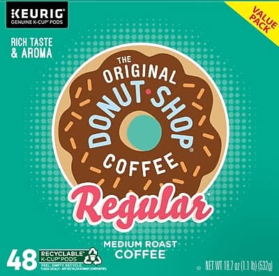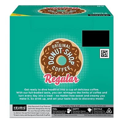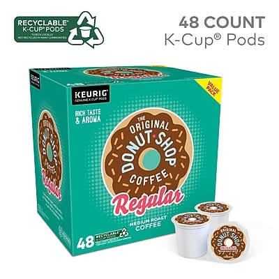 Keep a selection of Keurig Original Donut Shop K-Cup pods in the break room for a quick cup of coffee any time of day. Brew a medium roast cup of the Original Donut Shop coffee for a boost of caffeine with practically no wait. These Keurig K-Cups make it convenient to personalize your coffee experience by simply popping one in the machine. Individualized pods make these Original Donut Shop Keurig K-Cups an easy mess-free way to provide coffee in the conference or break room. - Coffee K-Cups for Keurig brewers - Medium-roast coffee - 48 K-Cups per box - The product is kosher - Made with 100% Arabica coffee Packaging: Reusable