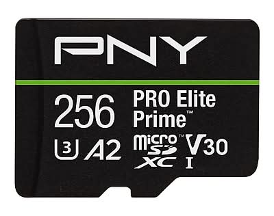 PNY 256GB PRO Elite Prime C10 U3 V30 A2 microSDXC Flash Memory Card – Ultra-Fast Speeds, Read 200MB/s, Write 150MB/s PNY PRO Elite Prime Class 10 U3 V30 A2 microSD Cards offer extreme performance for smartphones, tablets, drones, action cameras, surveillance cameras, gaming consoles, and more. With exceptional read speeds of up to 200MB/s and write speeds of up to 150MB/s when used with PNY Performance Prime Card Reader. Quickly capture high quality content, transfer, store and share media between devices at incredible speeds, particularly useful when editing footage. Featuring U3 technology and V30 Video Speed Class, the PRO Elite Prime microSD is ideal for HD photography and 4K Ultra HD videography at 4096x3072 format. Allowing users to capture high quality 4K video, HD photos, music, apps, and more. Rated A2 optimizing the PRO Elite Prime microSD for app performance; allowing users to run apps directly from the microSD card, delivering faster app launch and performance than ever before. Experience next level performance and high-capacity storage options of up to 1.5TB with PRO Elite Prime microSD cards! - Extreme Performance - U3, V30 speed class performance with read speeds up to 200MB/s, and write speeds up to 150MB/s when used with PNY Performance Prime microSD Card Reader - Record and transfer videos, photos, music, files and more from microSD enabled host devices such to laptop and desktop computers using the Performance Prime Card Reader for extreme speeds facilitating accelerated workflows when editing content - A2 App Performance enables apps to run directly from the microSD card, delivering faster app launch and performance. A2 provides minimally 4000 IOPS (Read) and 2000 IOPS (Write) - Compatible with Android smartphones and tablets, action and surveillance cameras, drones, computers and more - Included SD adapter for compatibility with SD enabled host devices including DSLR cameras, video cameras, desktops, and laptops