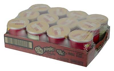 Add this can of Pringles Grab & Go original chips to lunch totes for a convenient snack. Satisfy your salty craving with this can of chips. The edge-to-edge flavor and stackable shape offer a delicious taste with the perfect crunch. A convenient cardboard tube keeps chips stacked on top of each other, and a plastic lid keeps each chip in these Pringles Grab & Go original chips fresh and ready for consumption as a snack or lunch side. - Chips in original flavor are delicious and tempting - This product is kosher (pareve) and sugar-free - 1.3 oz. packages - Served in cans - 12 per pack - Perfect for the office break room, meetings, and parties Packaging: Reusable