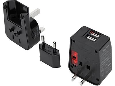 Recharge your devices on international trips with this Targus two-port USB world travel power adapter. Make devices compatible with multiple types of outlets using this power adapter. A compact design offers easy portability, while the four integrated charging plugs provide compatibility with various international outlet formats. This Targus two-port USB world travel power adapter has two USB ports so you can charge devices simultaneously. - World travel power adapter with dual USB charging ports - Dimensions: 1.75H x 3W x 0.87D - Comes in black - Output: 100-240V and 5V/2.1A - Features two USB ports and one standard AC plug-in device - Four integrated charging plugs are compatible nearly the whole world over - Input: 100-240V, 3A AC - Compatible with countries in Africa, Asia, the Caribbean, Central America, Europe, the Middle East, and North America - 1-year manufacturer limited warranty