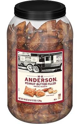H.K. Anderson Nuggets are loved by both salty and sweet snackers. Fuel your sweet and salty snack craving with these HK Anderson Peanut Butter Filled Pretzel Nuggets. Combining the salty flavor and crunchy texture of pretzels with the smooth, creamy texture and sweet taste of peanut butter, these pretzel nuggets work to satisfy just about any kind of snack craving. - 44 oz. Tub - Pretzels are delicious and tempting in peanut butter flavor - Kosher - 30gram serving size - 140 calories per serving size - Contains total fat (7gram), saturated fat (1.5gram), sodium (330mg), total carbohydrate (15gram), dietary fiber (2gram), sugars (2gram), protein (2gram), vitamin A, vitamin C, calcium, and iron - Perfect for the office breakroom, or on-the-go snacking - Ready to eat