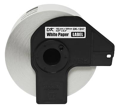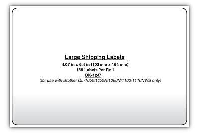 The Brother DK-1247 Large Shipping White Paper Labels are great for flat envelope addresses, binders, large-size packages, storage boxes, and more. For use with Brother QL-1100, QL-1110NWB, QL-1050, QL-1050N, and QL-1060N label printers. You get 180 labels per roll. Brother Genuine DK labels are Engineered With Excellence. Trust the longstanding reliability of Brother Genuine Supplies for all of your Brother QL printing needs. Protect your label printer investment: using unreliable aftermarket labels may result in damages to your label printer that may not be covered under warranty. - Die-cut Large Shipping paper labels - 4.07 in x 6.4 in (103 mm x 164 mm) - 180 labels per roll - Great for Flat envelope addresses, binders, large-size packages, storage boxes, and more - For Brother QL-1050, QL-1050N, QL-1060N, QL-1100, and QL-1110NWB, label printers - Brother Genuine DK labels are Engineered With Excellence- Trust the longstanding reliability of Brother Genuine Supplies for all of your Brother QL printing needs.- Protect your label printer investment: using unreliable aftermarket labels may result in damages to your label printer that may not be covered under warranty.