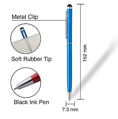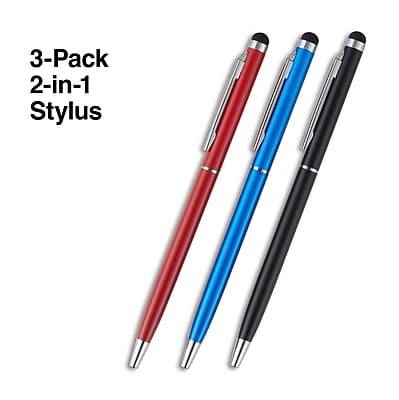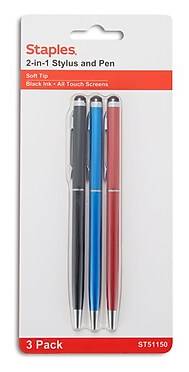 Two products in one - a stylus for your tablet and a pen for writing Take notes on paper and touch displays with these Staples two-in-one stylus and pens. These convenient styluses are compatible with all capacitive touch screens and feature soft rubber tips for precision touch navigation and a smooth, satisfying digital writing experience. This 3-pack of Staples two-in-one stylus and pens lets you easily switch from screen to paper with their built-in black ink. - Includes three 2-in-1 stylus pens - Precisely and comfortably navigate any touch screen - Compatible with all capacitive touch screens - Soft and durable rubber tip glides across the screen with ease - Pen features black ink for smooth writing - Pen features black ink for smooth writing - Keeps screen clear of fingerprints and smudges - Black, Red, and Blue barrel color - Staples 100% Satisfaction Guarantee Whether you need a pen for writing or a stylus for your tablet, the Staples 2-in-1 Stylus and Pen has you covered. This stylus 3-pack makes it easy to type, draw, or turn pages on your smartphone or tablet, while keeping the screen clean of smudges and fingerprints. The soft, durable rubber tip glides effortlessly across the screen, making precise selections a breeze. With smooth, black ink included in the barrel, the stylus is also a pen for writing. Navigate your smartphone or tablet with comfort and precision, and always have a pen with you with the Staples 2-in-1 Stylus and Pen.