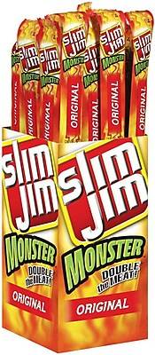 Slim Jim Original monster stick in 1.94 oz bag is a spicy beef snack that battles emergency spice loss rendering unique combination of great taste, spice and attitude18 count. Slim Jim 1.94 oz Original monster stick offers a full line of beef jerky that has three levels of heat and moist and tender steakhouse strips offering great taste. Stick saves your reputation from an embarrassing trip to manmergency room. - 1.94 oz. resealable pack - Come in handy when the pressure of adult responsibility and mature decisions overwhelms your body s spice receptors - Spicy beef snacks that combat emergency spice loss, try all three levels of heat today - Weight: 1.94 oz.