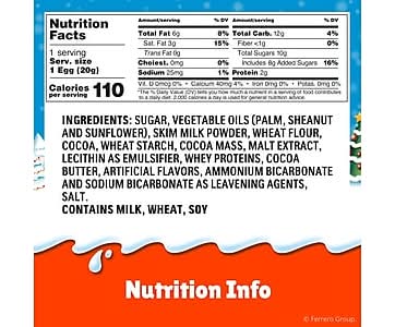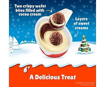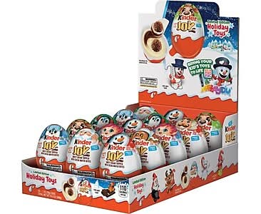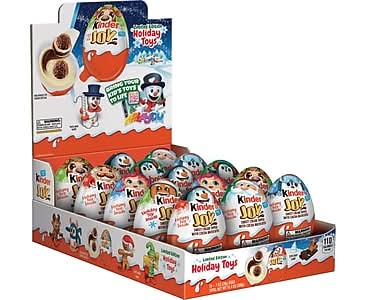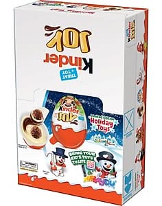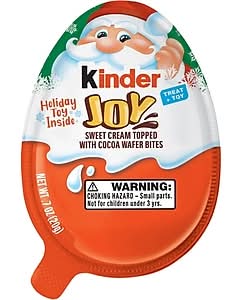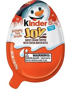 Add some joy to your stocking. The KINDER JOY Holiday Toys is a delicious treat in an iconic egg shape to surprise and delight. One half of the egg contains two layers of sweet creams topped with two crispy wafer bites filled with cocoa cream. The other half of the egg contains an exciting surprise toy. - Spread some joy with a holiday Christmas treat that features a surprise toy and makes great stocking stuffers and party favors for kids - 15 eggs per carton - Contains: milk, wheat, and soy - Net weight: 10.5 oz. - Tasty treat with two layers of creamy deliciousness: one cocoa and one sweet cream; plus, two crispy, chocolatey-covered wafer bites filled with cocoa cream - Each egg comes with a unique toy inside, with over 100 to discover - Inspiring interaction, imagination, and creativity, this treat helps families create happy memories by bringing a world of fun in every egg - Discover more with the Applaydu app: just scan your kid's toys to unlock a whole new level of play and discovery