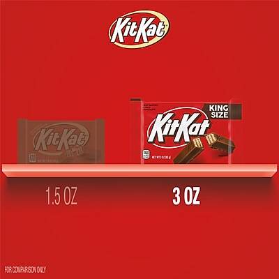Stock the break room with Kit Kat King Size candy bar. Ready for a classic everyone hopes to find in the candy selection? This king size KIT KAT® candy bar is wrapped for optimal convenience, easy sharing and lasting freshness. Whether you gift one to friends, pass some out in the office or hold onto a few for snacking moments, you can expect a delicious treat. - Contains one (1) 3-ounce KIT KAT® Milk Chocolate Wafer King Size Candy Bar - Enhance your lunch hour, snack break or movie night with a king size milk chocolate and wafer KIT KAT® candy bar - Kosher certified, king size milk chocolate and wafer candy wrapped for lasting freshness and convenience - Be the biggest hit at the birthday, anniversary, retirement, graduation, new baby or wedding party with classic milk chocolate wafer candy everyone there knows and loves - Enjoy a delectable, snap-worthy king size treat made of crisp, crunchy wafer bars coated in smooth, creamy milk chocolate perfect for Valentine's Day, Christmas, Easter and Halloween candy selections - Place sections of your KIT KAT® king size candy bar on top of any cookies or brownies you bake for an extra sweet treat sure to become everyone's new favorite Throw a bar in your lunch box to treat yourself to a sweet dessert, or stock your home and office candy cabinets with an easily shareable snacking classic. .