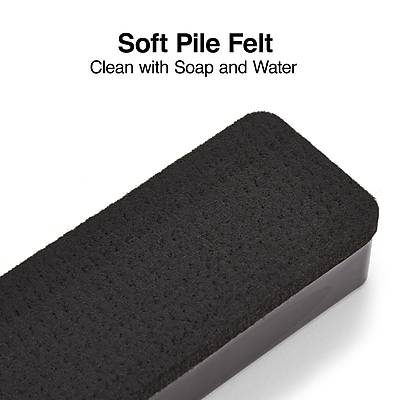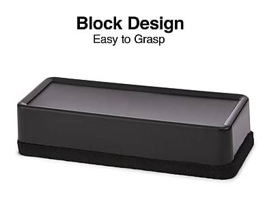 Wipe away marks on dry-erase boards, whiteboards, or glass with this Staples dry-erase eraser. Clean whiteboards and other dry-erase surfaces with this eraser. Quick and convenient, this eraser is ideal for keeping on hand in meeting rooms, in classrooms or next to any surface where dry-erase markers are routinely used. The black color looks sleek in any space, and the lightweight construction is simple to handle. At just under 2 inches wide, this eraser sits easily on most whiteboard marker trays or can be slipped into other small storage areas. This Staples eraser wipes away dry-erase residue quickly and easily for clean surfaces and prevents damage to whiteboards from dried ink. - Lightweight eraser is ideal for quick erasing on a dry-erase surface - Black eraser - Dimensions: 1.2H x 4.7W x 1.8D - Prevents damage to whiteboards from dried ink - Fits on most whiteboard marker trays
