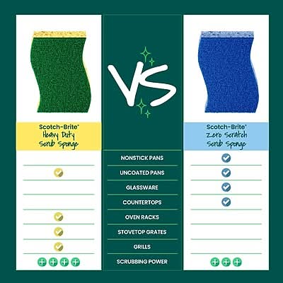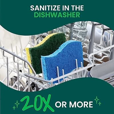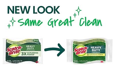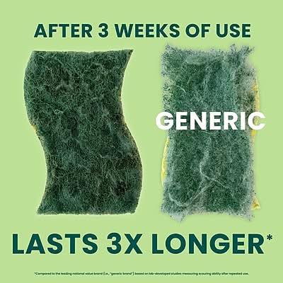 Number 1 selling scrub sponge in America. Don't fight baked-on, stuck-on messes - grab a Scotch-Brite Heavy Duty Scrub Sponge. With scrubbing fibers made from 100% recycled content, these long-lasting scrub sponges take on the toughest messes around the home. - 3X scrubbing power* for stuck-on messes - 3X SCRUBBING POWER*: Tackle tough messes with these heavy duty sponges that provide 3X more scrubbing power compared to other leading sponges. - LASTS 3X LONGER*: Made from durable material, these dish sponges last 3X longer than the leading national value brand. - PERFECT FOR TOUGH JOBS: They’re great for cleaning uncoated pots and pans, grates, oven racks, outdoor grills, and more. - FLEXIBLE, DURABLE, STRONG: These scrub sponges for dishes are S-shaped for a comfortable grip while getting into corners easily. - MADE FROM RECYCLED CONTENT: The scrubbing fibers are made from 100% recycled plastic for a sustainable clean. - SANITIZE UP TO 20X: Sanitize and clean these kitchen sponges in the dishwasher 20X or more! - AMERICA’S #1 SPONGE BRAND: Known for innovation in cleaning tools and trusted for 65 years*, our commitment to quality and satisfaction makes Scotch-Brite America’s #1 Sponge Brand. (*2023 Ipsos Brand Health Study) - Look for Scotch-Brite Scrub Dots, Non-Scratch, and Gentle Clean Scrub Sponges, too! - *Compared to the leading temperature-reactive sponge based on lab developed studies measuring scouring ability after repeated use - **Compared to the leading national value brand (i.e., “generic brand”) based on lab developed studies measuring scouring ability after repeated use Experience a gratifying clean with Scotch-Brite Heavy Duty Scrub Sponges. These scrubber sponges have 3x more scrubbing power compared to leading temperature-reactive sponges [based on lab-developed studies measuring scouring ability after repeated use]. Use these tough heavy duty scrubbing sponges for cleaning grease, grime and dirt on safe-to-use surfaces, such as non-coated cookware, oven racks, concrete and tools. Even the messiest of dishes and surfaces will shine like new with a quick and easy scrub from these versatile kitchen sponges. The scrubbing fibers of these heavy duty scrub sponges are made from 100% recycled content for a sustainable clean. Make sure to replace your scrubber sponge every three weeks to get the best performance. To clean, simply put the scrubbing sponge you are using in the dishwasher top rack to sanitize and reuse it. Please note that some product packaging of the scrubbing sponges may look different from the images displayed. One package contains three scrub sponges, so you can buy them in bulk and not have to make a trip to the store every time you need to replace your sponges. Stock up your cleaning supplies with Scotch-Brite Heavy Duty Scrub Sponges and see why Scotch-Brite is the beloved cleaning brand for many households. Scotch-Brite gives you the power to clean up life’s everyday messes — in the kitchen and beyond. From everyday jobs to cleaning hacks, you'll see why Scotch-Brite Brand is America’s #1 selling scrub sponge brand.