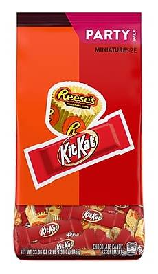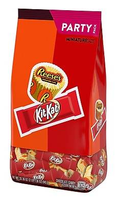 Contains one (1) 30.04-ounce party pack of REESE'S and KIT KAT Miniatures Assorted Milk Chocolate Candy Enjoy a delicious, chocolatey treat anywhere and anytime with a variety party pack of assorted REESE'S and KIT KAT® Miniatures milk chocolate candy. Offering two crowd-pleasing favorites you already know and love, this candy assortment is perfect for sharing with family, friends, teammates or co-workers. Take this party pack into the office break room, pour some individually wrapped candies into your jar at home or take a bag to your next sports game to celebrate the win. Hershey candies are also great for parties, lunch boxes, holidays, desserts, picnics, tailgate events and more. - Chocolate candy mix is a perfect addition to any dessert table - 30.04 oz. package - Individually wrapped candies make it easy to share them You really can't go wrong when you have classic miniature candies on hand. This assorted bag of chocolate candies contains REESE'S milk chocolate peanut butter cups candy and KIT KAT® milk chocolate wafer candy bars — both in miniature pieces for the perfect bite size treat. Add them to your holiday festivities, too! Stuff Christmas stockings, fill Easter baskets, stock Halloween candy bowls and trick-or-treat bags and create sweet Valentine's Day gift boxes with this mix of treats that everyone on your list will love. Make every major holiday and all of the little moments in between a little sweeter with this party pack bag of individually wrapped candies.