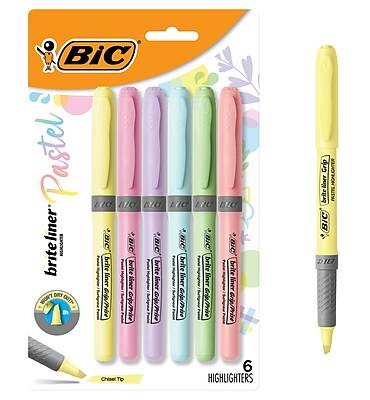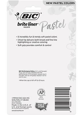 Make organization fun and easy with the BIC Brite Liner Grip Pastel Highlighter Set Each thin highlighter marker has a versatile chisel tip that creates fine and broad lines. BIC highlighter marker features translucent ink that emphasizes what’s important without obscuring the text below. Each highlighter pen can write for up to eight hours without a cap and not dry out. BIC Brite Liner Grip highlighters fit snugly in your hand and have a soft grip for added comfort and control. These soft and subtle best highlighters make great gifts for creatives and as office supplies or school supplies. Each highlighter pack contains 6 chisel tip highlighter markers, with two in each of the following six colors: Orange, Yellow, Green, Blue, Purple and Pink. BIC multi color highlighters are non-toxic and ACMI-approved for a high-quality, safe product you can trust. - One 6-Count Pack BIC Brite Liner Grip Pastel Highlighter Set, Assorted Colors - BIC best highlighters are thin with a versatile chisel tip that creates both fine and broad lines - Each highlighter pen can write for up to 8 hours without a cap on and not dry out - Best highlighters fit snugly in your hand with soft grips for added comfort and control - Pastel best highlighter set featuring markers in six trendy colors: Orange, Yellow, Green, Blue, Purple and Pink (assortment may vary) - Pastel colored and yellow best highlighters are ideal for highlighter use on textbooks, notebooks, documents and more. - ACMI-approved highlighters are a perfect addition to your art, school or office supplies