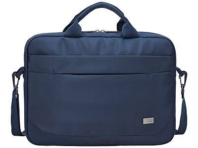 Case Logic streamlined laptop bag with smart storage for the modern professional. - Attache notebook carrying case keeps your laptop and other work essentials neatly packed - Comes in dark blue and made of polyester - Padded top handle provides an alternative carry option - Dimensions: 12.99H x 14.57W x 2.76D - Padded sleeve provides quality protection for laptops up to 14 - Dedicated slip pocket for a 10.1 tablet - Spacious front pocket with organization panel for pens and small electronics, plus plenty of room for bulky charging cords - Front pocket with hidden zipper garage keeps phone secure and accessible - Designated file pocket keeps documents separate from electronics - Removable padded shoulder strap adjusts for a custom fit - Luggage strap securely attaches slim case to most rolling luggage - 25-year manufacturer limited warranty