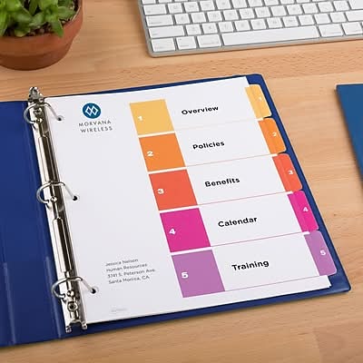 Keep binders organized and searchable with these Avery Ready Index numbered 1-5 multicolor table of contents dividers. Organize your projects in moments with Avery Ready Index 5-tab dividers. Each tab is preprinted and uniquely color coded for a professional appearance. Print your own custom section titles and images onto the table of contents sheet without worrying about labels or inserts. Whether you're creating planners for classes or hosting a presentation, these dividers are ideal for getting everything sorted.1 set of 5 tabbed dividers are included with each sheet measuring 8-1/2x11. The 3 binder holes are reinforced on both sides of the heavyweight sheet to prevent creasing and tearing. Each divider tab includes additional reinforcement along the edge of each page to distribute stress and resist folding.The printable table of contents is dual compatible with both laser and inkjet printers. This sheet can also be printed in either portrait or landscape so that your projects can be displayed in any orientation. Just flip the sheet to view the other layout on the opposite side. Try out free templates for these dividers and check out the Avery Design & Print software at avery.com/templates. - Keep track of your tab dividers quickly and easily with the printable table of contents sheet - Add graphics, logos and titles to the table of contents page with free templates at avery.com/templates - 1 set of 5 dividers are included with sturdy tab and hole reinforcements on both sides - Reinforced multicolor tabs are preprinted and don't require inserts or labels - Versatile design works in either portrait or landscape orientation and is great for project binders and training manuals - Securely insert the 3 hole-punched paper dividers into your favorite 3 ring binder - The page dividers' table of contents is both inkjet and laser printer compatible - Stay organized and enjoy a professional binder appearance suitable for any work or home office with the uniquely color-coded tabs