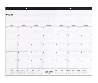 Ensure your schedule is in front of you with this Staples 21.75 x 17-inch desk pad calendar. Write down appointments in this desk pad calendar. The black and white design delivers a professional look, while the horizontal pattern lets you easily view written notes. Featuring a glue top-bound construction and black poly corners, this calendar offers durability. This Staples 21.75 x 17-inch desk pad calendar has extra rulings at the top for making the most of your monthly layout space. - Outfit your workstation with this 2026 desk pad calendar - Dimensions: 21.75 x 17 - January 2026-December 2026 desk pad calendar - Ruled daily blocks measure 3.125 x 2, perfect for keeping notes organized - Monthly calendar in white with black trim colors - Comes in landscape orientation - Features additional space for notes and to-do lists on each page in addition to the full 2026 monthly breakdown at the bottom - Two top eyelets for optional wall hanging - One month per page allows you to keep notes and organization neatly aligned and provides plenty of writing space, making planning easier