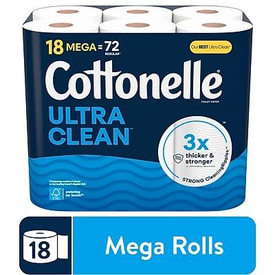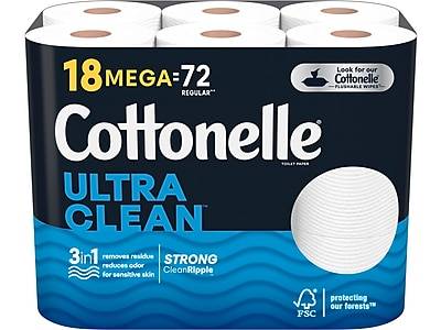 The Cottonelle Ultra Clean toilet paper is designed for cleaning, featuring a unique CleaningRipples texture to help you clean more at once for a confident clean. Made with fibers that are 100% biodegradable and safe for sewers and septic tanks, this single-layer toilet paper is also three times thicker, three times stronger, and twice more absorbent. Sourced from responsibly managed forests. - 1-ply toilet paper in 312-sheet rolls - Removes residue that can cause irritation, removes odor-causing bacteria, and is designed for sensitive skin - Use this toilet paper and Cottonelle flushable wet wipes together for a refreshing, shower fresh clean - 312 sheets per roll, 18 mega rolls per pack - Comes in white - Meets or exceeds the FSC standard - Septic safe and three times stronger to keep your hands protected and clean - Features a unique CleaningRipples texture to help you clean more at once for a confident clean - Sourced from responsibility managed forests to prevent deforestation and only uses fibers that are 100% plant-based and free of harsh chemicals Packaging: Reusable