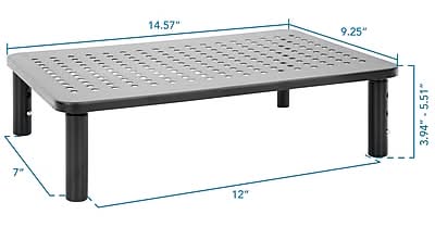 Adjustable Desktop Riser with Ventilation for an Efficient and Comfortable Workspace. It Enhances Comfort and Saves Space, perfect for an Ergonomic Workspace. The MI-7363 slim metal riser will create a more ergonomic workspace by elevating your laptop or monitor. Create more desk space by adjusting the screen to store office essentials under the riser. The legs feature silicone pads that will protect your work surface from scratches. - Reduce hours of strain on your neck, back, and shoulders while increasing your overall health too! This computer monitor riser is both functional and stylish, with the added bonus of promoting passive heat ventilation and airflow - Place your monitor or laptop on this metal computer stand and free up some space. The extra storage underneath reduces clutter and offers plenty of space for your keyboard, mouse, or other home office supplies when your day is done - This computer monitor platform features 3 adjustable height levels. Simply press the button on the leg and lift the platform to adjust to your preferred height level from 3.94 to 5.51 - Everything you'll need to assemble this compact computer monitor riser comes right inside the box and takes little to no effort to bring together - Using high-quality and premium sourced metal, this computer riser for your desk monitor can hold up to 44 lbs. With the anti-slip silicone padding underneath the solid frame, your workstation won't budge and won't scratch your desk or tabletop - Support up to 44 lbs., dimensions: 14.57 W x 9.25 D - Can support most laptops, monitors, printers or even desktop computers - Ventilation helps keep devices cool. Rubber pads protect work surface from scratches - Compatible with screens ranging from 11 to 32 inches. - Proudly designed, quality-controlled, and supported in the U.S. by a small business delivering trusted solutions since 2006. - Supported by manufacturer's limited lifetime warranty Experience an organized and ergonomic workspace with our laptop / monitor riser. Easily adjust its height, keep your devices cool with built-in ventilation, and free up desk space for a tidy, comfortable work environment. Made from premium materials, this riser is built to last.