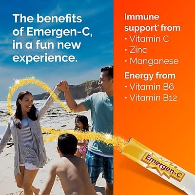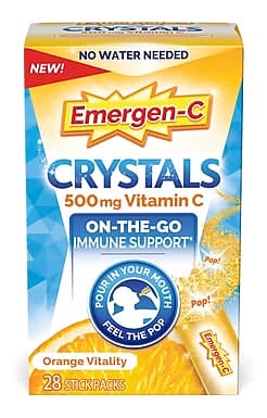 Emergen-C Crystals offer immune support in a convenient, no-water-needed crystal popping experience. Just pour the crystals in your mouth and feel the pop to emerge your best on-the-go. - Box of 28 Stick Packs of orange vitality flavored Emergen-C Crystals, On-the-Go Emergen-C immune support (1) Supplement with Vitamin C, B Vitamins, Zinc and Manganese - Provides immune support (1) with 500 mg of vitamin C—more vitamin C than 10 oranges in two stick packs (2) - Vitamin C supplement that naturally enhances energy with vitamin B (1) - Contains antioxidants zinc and manganese - Caffeine-free, gluten-free and vegetarian vitamin C with zinc supplements - Convenient packs are easy to use with no water needed—just pour the crystals in your mouth and feel the pop to emerge your best on-the-go Packaging: Reusable