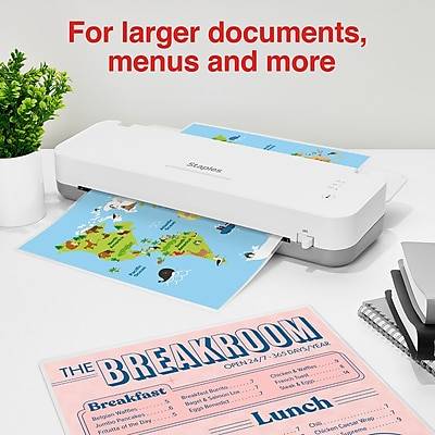 Keep documents clean and safe with this 25-pack of Staples menu-size 3-mil thermal laminating pouches. Protect documents from dirt, damage, and spills with these Staples menu-size thermal laminating pouches. Each laminating pouch is made with clear, strong material to provide durability and water resistance while keeping contents easy to read, while the glossy finish adds a sleek, professional appearance. These Staples menu-size thermal laminating pouches are easy to use and are compatible with most hot laminators. - Thermal laminating pouches protect documents you handle frequently - Measures 12W x 18L and has 3 mil thickness - Glossy thermal pouches come in clear color with high transparency for professional results - Compatible with all laminator brands, giving you many choices - Pack size of 25 offers an economical purchase - Safety Data Sheet Use these high-quality Staples menu-size thermal laminating pouches to protect larger documents up to 11-by-17 inches in size. A sturdy 3-mil-thick construction makes these laminating pouches ideal for use in busy environments. When laminated, documents are easy to wipe clean and stay protected day after day. Durable Construction These heavy-duty Staples laminating pouches are made of premium 3-mil-thick plastic, which seals beautifully to create a protective coating over paper and card stock. Menus, 11-by-17 calendars, large documents and more stay looking new for longer when they're enveloped in these laminating pouches. Laminated documents are easy to wipe clean with a damp cloth. Versatile and Easy to Use Use these laminating pouches to create DIY dry-erase boards, to protect maps from inclement weather and to create durable teaching materials for classroom use. Simply insert any paper or card-stock document into the pouch and run the document through your large-format laminating device to create a permanent seal. Bulk Convenience Use this 25-pack of laminating pouches to ensure that you are ready to laminate large documents at all times. These pouches, which have an attractive glossy finish, are compatible with all large-format laminating machines, making them an adaptable addition to any stationary closet.