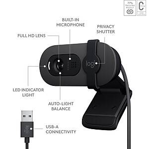 Many in stockShow Up Bright, Sound Clear, and Stay Private — The Logitech Brio 100 Is the Affordable Full HD Webcam That Lets You Shine in Every Call. Look, sound, and meet better with the Logitech Brio 100, a simple and affordable webcam that lets you show your best self in video calls. Full HD (1080p) resolution and auto-light balance bring clarity and brightness to your calls, so you look your best. Sound better with a built-in microphone, and get total privacy with an integrated shutter. The Brio 100 comes in fun, sophisticated colors that let you express yourself at your workspace. Made with a minimum of 34% recycled plastic. - Full HD (1080p) webcam with an auto-light balance brings clarity and brightness to your calls, so you look your best - Built-in omnidirectional microphone lets others hear you clearly during video calls - Webcam dimensions: 1.26H x 2.87W x 2.62D - Features plug-and-play USB Type-A connectivity - RightLight 2 automatically balances brightness, adjusts contrast, and compensates for challenging light environments to create a natural presentation - Integrated webcam cover makes it easy to get total, reliable privacy when you're not on a video call - Coordinate and express yourself when working from home with a choice of fun yet sophisticated colors that go great with your setup - Made with a minimum of 34% postconsumer plastic - Works with most video calling platforms, including Microsoft Teams, Zoom, and Google Meet Packaging: Reusable