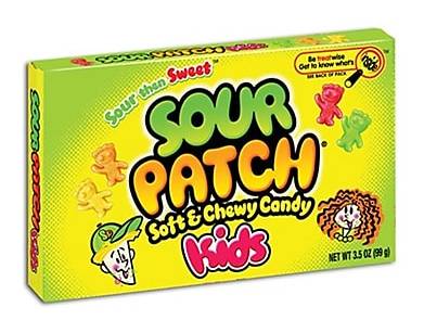 Soft gummy candy with a coating of sour sugar and packed in a 3.5 oz. theater box. Cadbury Adams 3.5 oz Sour patch kid's theater box comes with lemon orange, lime and cherry flavor candies. Theater box has candies that are fat/nut free and is ideal for fun parties. - Lemon, Orange, Lime, and Cherry - 3.5 oz. Theater Box - 12 Theater Boxes per order - Made in the USA - Fat Free - Nut Free